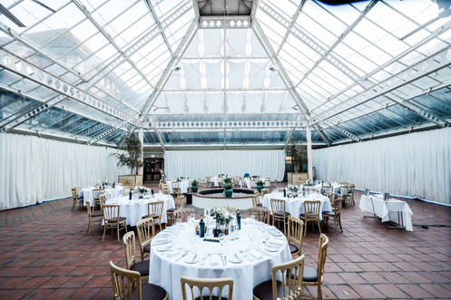 The evening was held in the Conservatory Atrium where guests were welcomed by a flowing central fountain and tropical plants. The romantic venue was filled with fairy lights that met at a point in the middle of the clear ceiling, making them look like glittering stars against the night sky.